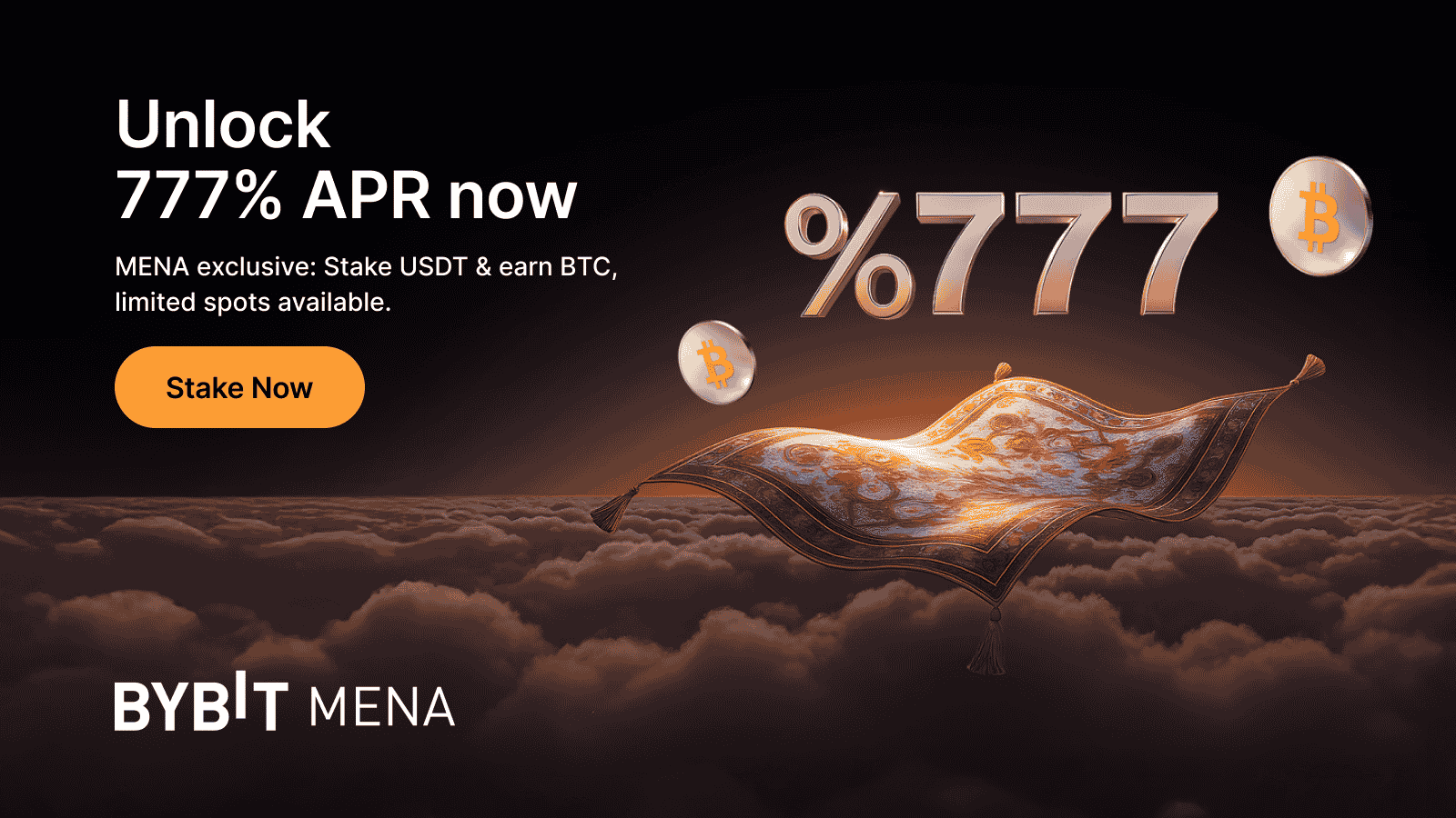 Bybit is thrilled to announce a limited-time staking offer exclusively for new users in the MENA region. Stake your USDT on Bybit Earn and enjoy a whopping 777% APR payout in BTC. Hurry, as rewards are limited and available on a first-come, first-served basis, so maximize your earnings while you can!